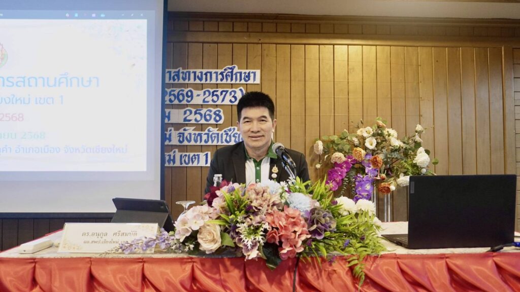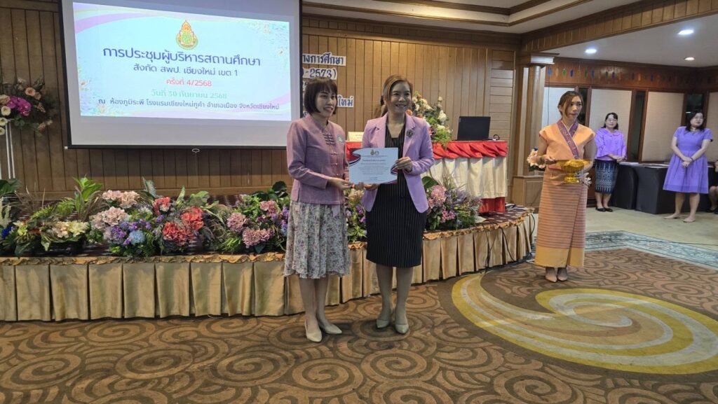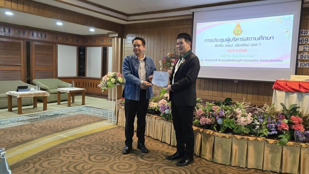 วันอังคารที่ 30 กันยายน 2568 เวลา 09.00 น. ดร.อนุกูล ศรีสมบัติ ผู้อำนวยการสำนักงานเขตพื้นที่การศึกษาประถมศึกษาเชียงใหม่ เขต 1 (ผอ.สพป.เชียงใหม่ เขต 1) เป็นประธานการประชุมผู้บริหารสถานศึกษาในสังกัด ครั้งที่ 4/2568 โดยมี นายเสน่ห์ รัชฎา นางหทัยรัตน์ ชาญศรี รอง ผอ.สพป.เชียงใหม่ เขต 1 พร้อมด้วย ผอ.กลุ่ม/หน่วย ผู้บริหารสถานศึกษาในสังกัดและเจ้าหน้าที่ผู้เกี่ยวข้องเข้าร่วมประชุม เพื่อแจ้งข้อราชการสำคัญ แนวปฏิบัติราชการและข้อสั่งการ ของ ผอ.สพป.เชียงใหม่ เขต 1 ตามนโยบาย กระทรวงศึกษาธิการ สำนักงานคณะกรรมการการศึกษาขั้นพื้นฐาน ในโอกาสนี้ ดร.อนุกูล ศรีสมบัติ ได้มอบโล่รางวัลและเกียรติบัตรรางวัล ที่มีวิธีปฏิบัติที่เป็นเลิศ ให้แก่ผู้บริหารโรงเรียน ครูและบุคลากรทางการศึกษาในสังกัด ด้วย จัดขึ้น ณ โรงแรมเชียงใหม่ภูคำ อำเภอเมืองเชียงใหม่ จังหวัดเชียงใหม่