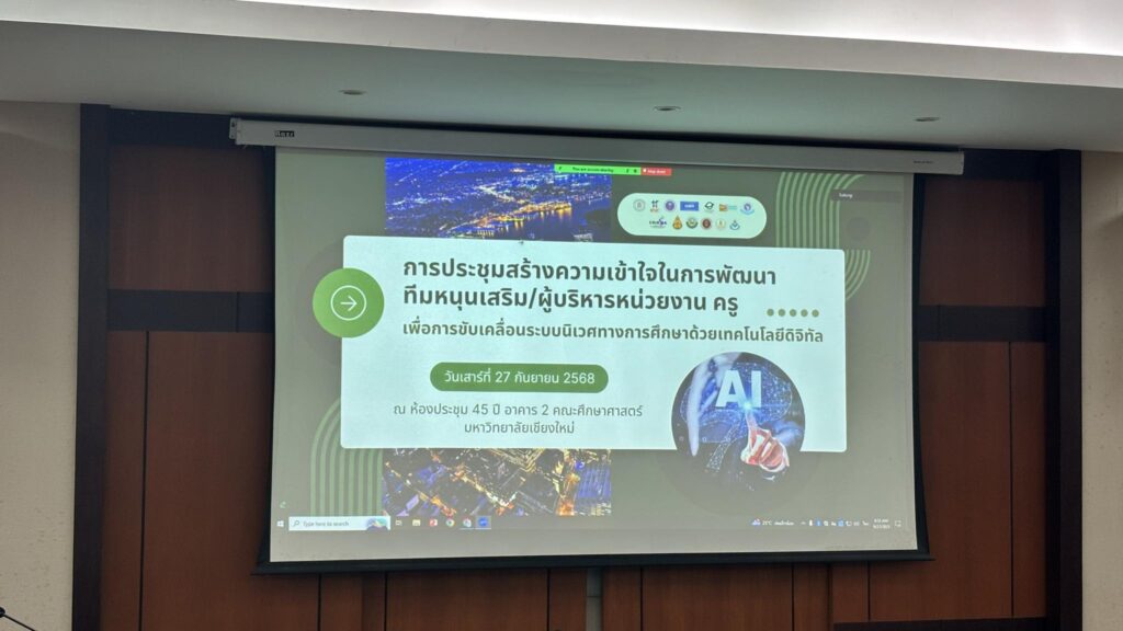 วันที่ 27 กันยายน 2568 ดร.อนุกูล ศรีสมบัติ ผู้อำนวยการสำนักงานเขตพื้นที่การศึกษาประถมศึกษาเชียงใหม่ เขต 1 พร้อมทั้งศึกษานิเทศก์เข้าร่วมโครงการวิจัยเรื่องกลไกลการขับเคลื่อนระบบนิเวศทางการศึกษาด้วยเทคโนโลยีดิจิทัลเพื่อการเรียนรู้สู่การยกระดับความสามารถ การคิดวิเคราะห์และสมรรถนะสูงของเด็กและเยาวชนจังหวัดเชียงใหม่ กิจกรรมการประชุมสร้างความเข้าใจในการพัฒนาทีมหนุนเสริม/ผู้บริหารหน่วยงาน ครู เพื่อขับเคลื่อนระบบนิเวศทางการศึกษาด้วยเทคโนโลยีดิจิทัล ณ ห้องประชุม 45 ปี อาคาร 2 คณะศึกษาศาสตร์ มหาวิทยาลัยเชียงใหม่